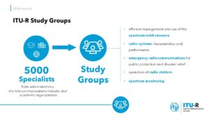 ITU-R Study Groups develop the technical bases for decisions taken at World Radiocommunication Conferences and develop global standards (Recommendations), Reports and Handbooks on radiocommunication matters. More than 5,000 specialists, from governments, regulators, the telecommunications industry and academic and research organizations, participate in the work of the Study Groups on topics such as efficient management and use of the spectrum/orbit resource, radio systems characteristics and performance, spectrum monitoring and emergency radiocommunications for public protection and disaster relief.